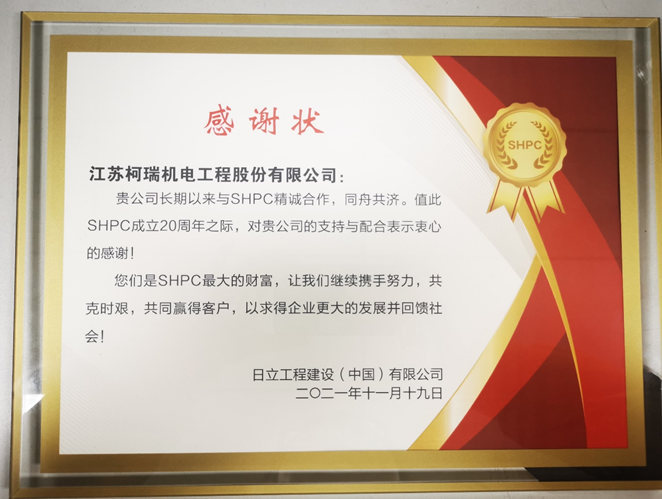 喜报! 柯瑞工程收到日立工程建设(中国)有限公司感谢状