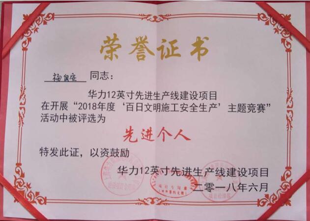 喜报 ——祝贺我司项目经理杨自安被华力项目评为“百日文明施工安全生产”先进个人