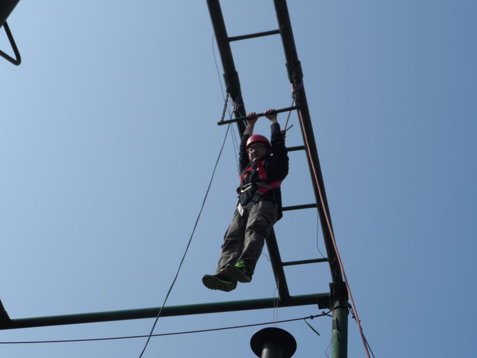 直径大于20公分的六根木桩成梯状悬于12米高空,最低一根距地约1.2米,且间距自下而上逐渐增大,小组成员分为2人一组,相互配合,共同登顶。