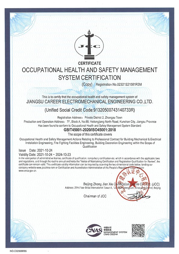 职业健康安全管理体系认证证书 英文
