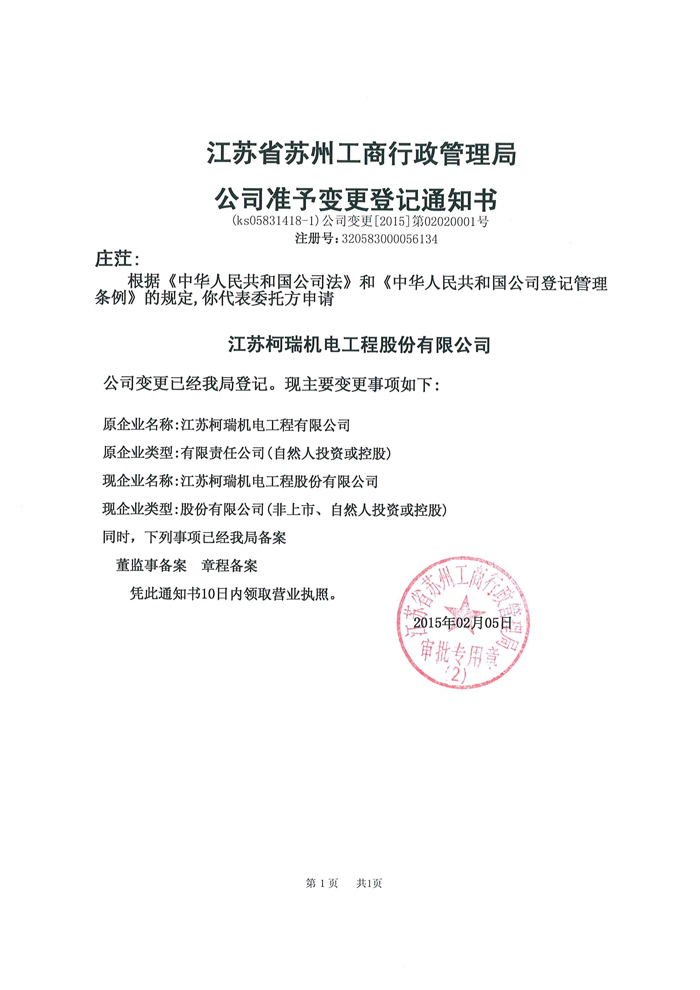 2015年02月05日起,我公司(原江苏柯瑞机电工程有限公司)完成股份制改制,正式更名为半岛官网首页登录入口。
